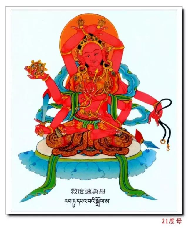 「右伸左蜷普欢愉,善能摧灭怨敌军」右伸左蜷,指为利益众生,非常欢喜地转动殊胜的法轮,也能摧毁轮回中的烦恼。本尊度母身红色,主为众生解除障碍,包括牢狱之灾。