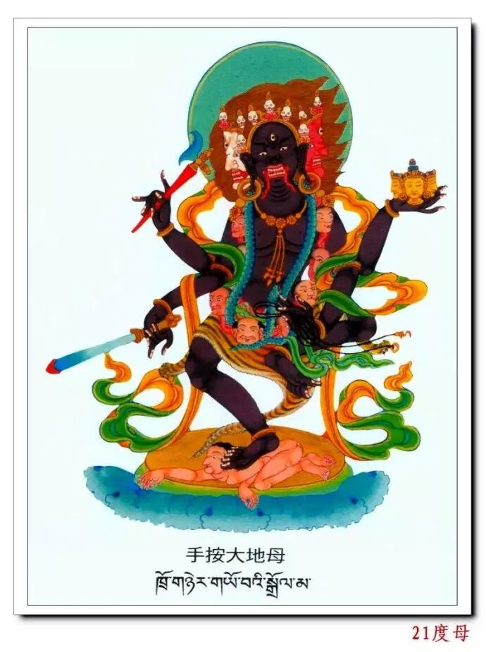 「敬礼手按大地母,以足践踏作镇压」是指度母以伸出之右足踏地,作镇压的姿态,手持忿怒印。