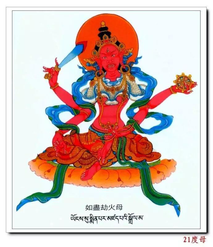 「敬礼如尽劫火母,安住炽盛火鬘中」:尽劫就是末劫。在末劫有大火,如同七个太阳般的炽热,烧尽世界而至三十三天──度母即安坐于犹如此末劫的大火中。
