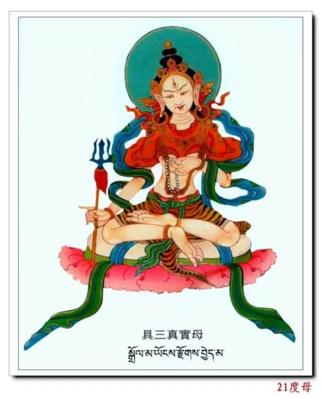「具三真实母」的具三真实是指度母的身语意三门具有身的「嗡」、语的「啊」、意的「吽」。