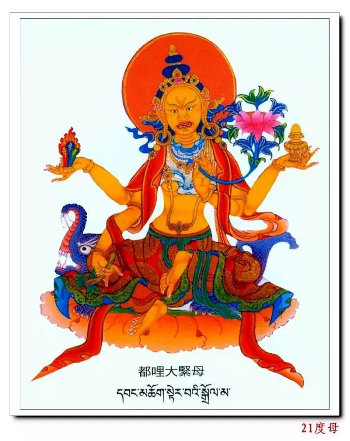「此乃赞颂根本咒」赞颂根本咒是如前所讲的「嗡哒咧嘟哒咧嘟咧梭哈」等等,「礼敬文共二十一」就是对二十一度母进行的礼赞。