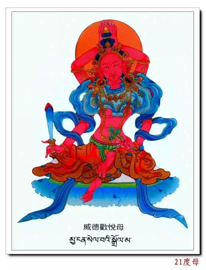 「敬礼威德欢悦母,宝冠珠鬘光灿烂」此尊度母欢喜、欢悦地圆满众生一切愿,所放威德光芒摄伏一切众生。
