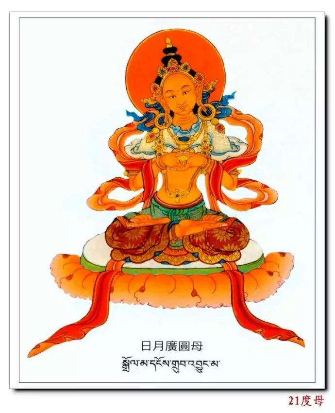「敬礼日月广圆母,双目炯然极明澈」是说度母相如日月广大圆满,也表达度母的忿怒相,日月是指眼睛,她现忿怒相时,眼睛如同太阳,寂静时则如月亮,由此双目放射无量光芒。
